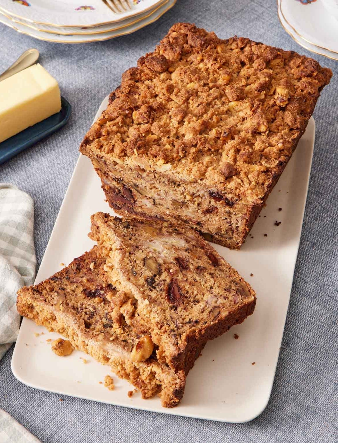 Banana bread with a lovely streusel topping gives you such a nice play of textures and added flavor. It’s like a crunchy icing filled with brown sugar, chopped toasted walnuts, and kissed with cinnamon and cardamom. It’s a truly lovely addition. In fact, you can make this crumb topping for any of your favorite muffins or quick breads, sprinkle it on, and bake as normal, and you will really enjoy it.
