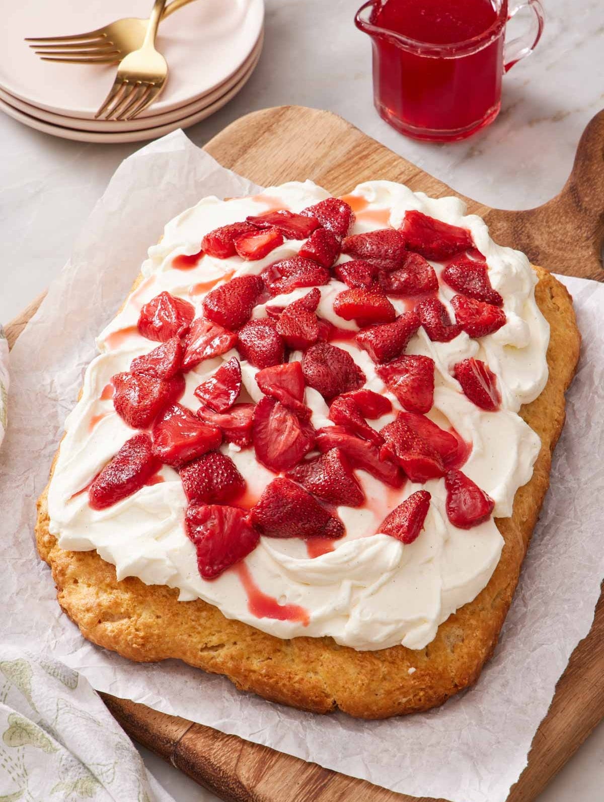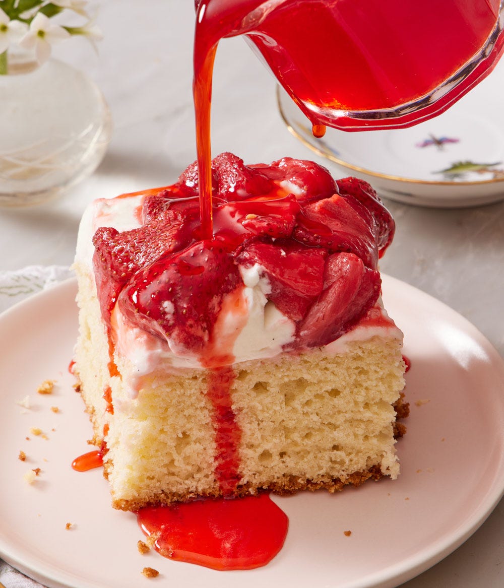 But I was thinking about how I could make it even better—the result was an even easier process and more flavorful dessert with this slab version topped with roasted strawberries! Assemble it all at once and slice it like a sheet cake to serve.