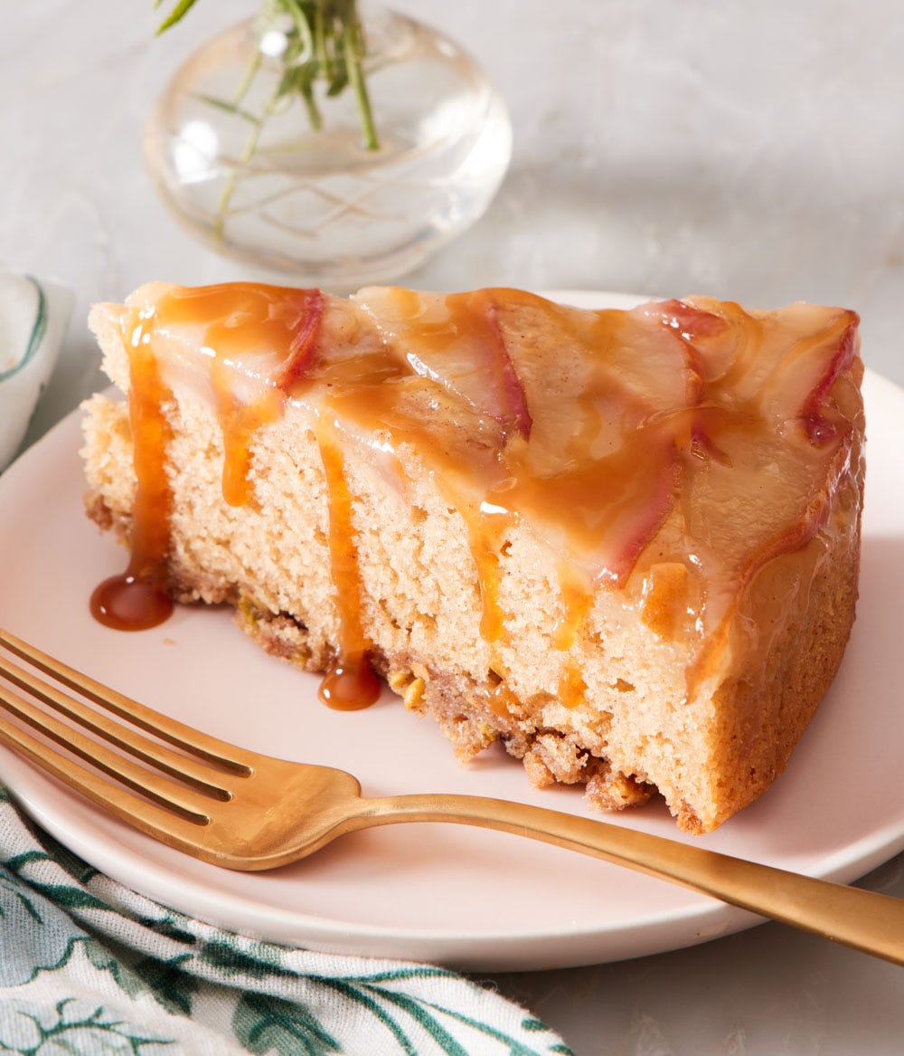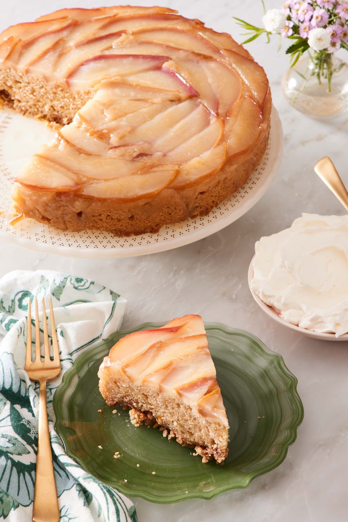 Upside-down cakes are just delicious. Their charm comes from leaving the oven fully decorated. The deliciousness relies on the fruit at the bottom. The fruit’s moisture gives the cake a tender crumb, while the chunks of fruit themselves act as an insulator, preventing your cake from forming a hard crust. And of course, whichever fruit you choose lends a lovely natural flavor. Yes, pineapple is the classic choice, but so many other fruits really do well in this type of cake, including pears!